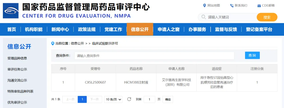 近日,艾尔普再生医学自主研发的注射用人脐带间充质干细胞(HiCM388)1类新药(受理号:CXSL2500607)临床试验申请正式获得国家药品监督管理局药品审评中心(NMPA)的默示许可。该药物针对急性 ST 段抬高型心肌梗死血管再通后患者,是国内首个治疗此适应证的细胞创新药。